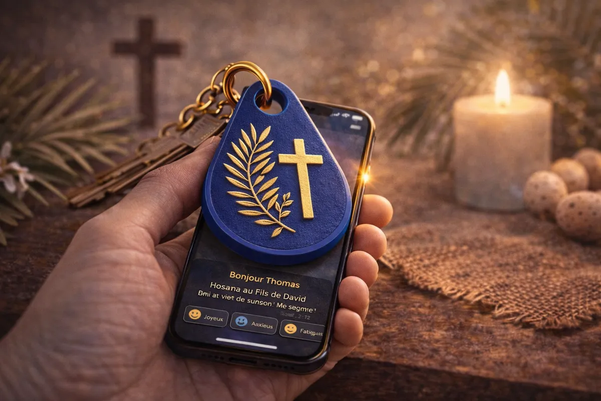 Le porte-clé LogosNFC, offert le dimanche des Rameaux, accompagnera le destinataire tout au long de cette semaine — et chaque matin de l'année qui suit.